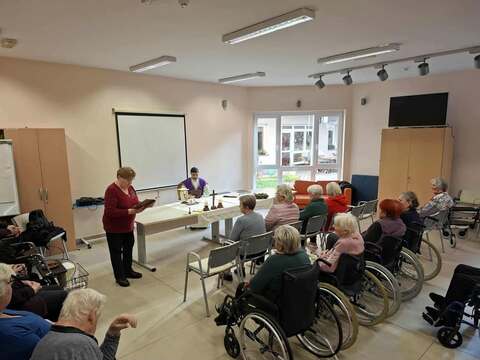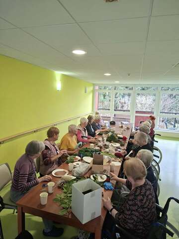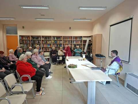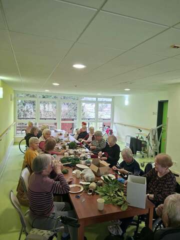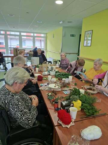 V domu smo ob prijetni glasbi in prijazni družbi z veseljem ustvarjali adventne venčke ter tako skupaj vstopili v praznični čas. Gospod Srečko Hren pa je daroval sveto mašo in blagoslovil venčke.